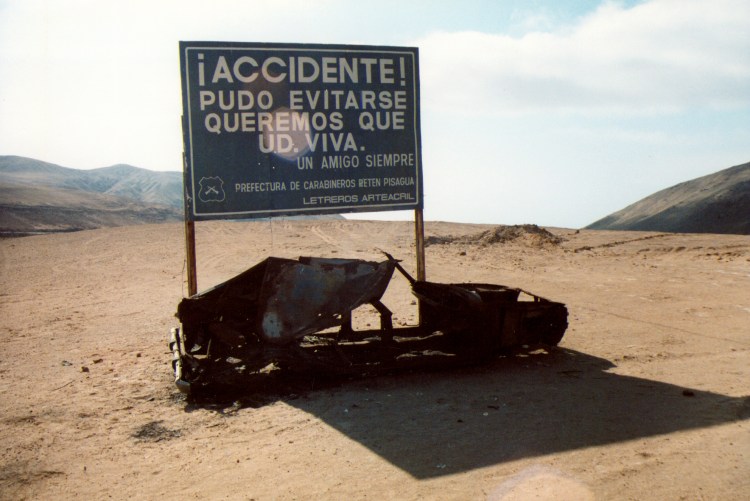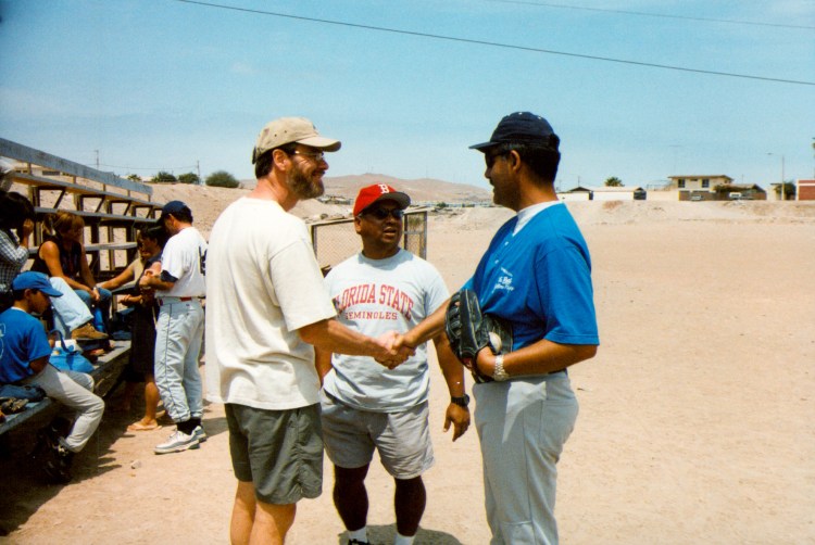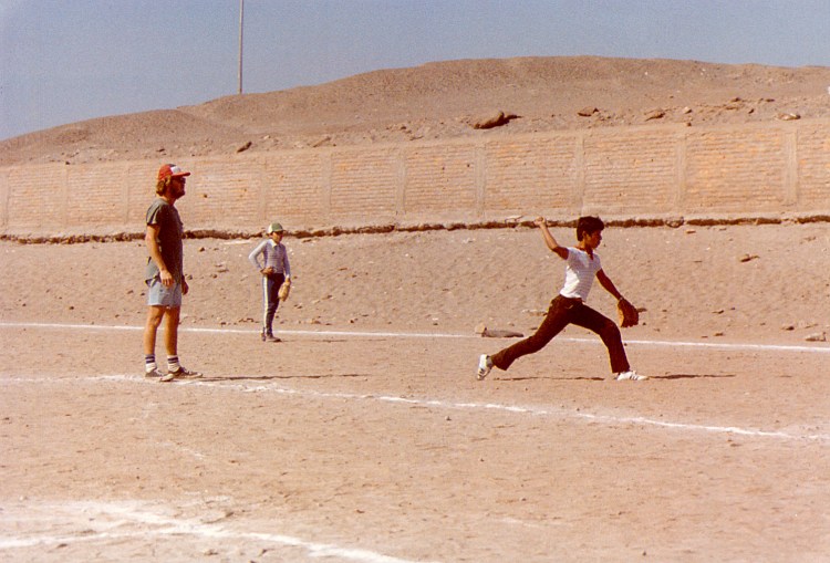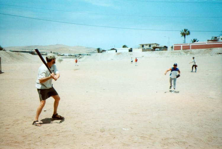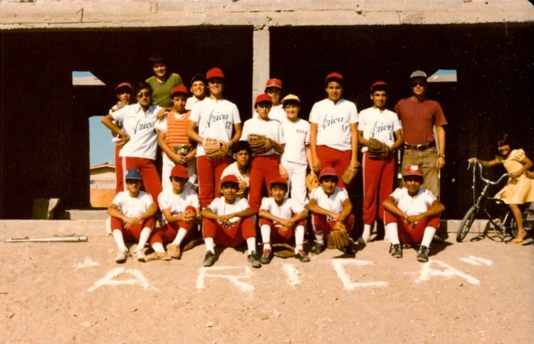 A game at the field by the Olympic pool.A game in Arica vs. a team from the neighboring (192 miles!) city of Iquique.Celebration after a game in Antofagasta.Arica all-star team (10-12 years old) for the 1980 national championship.Arica all-star team (13-15 years old) for the 1980 national championship.Future béisbolista.My room in Arica with Hugo Buitano, my best friend in Chile (1979).Waiting for the sun to thaw our frozen engine in Parinacota, altitude 14,400 feet, after our night with the schoolteacher and the Nazi (1979).Twin volcanoes on the altiplano in Lauca National Park, near Parinacota (1979).Earthquake-damaged church in Poconchile. En route to the altiplano (2003).Christine and I (and Panchy in the foreground) with llamas in Chucuyo, near Parinacota.Christine and her toddler friend in Parinacota (population 29 in 2002).Christine and her friend walking in Parinacota.Tom with the girl and her mother—who might be one of the kids in the 1979 photo with the frozen VW.Parinacota Christine and Panchy on the Pan-American Highway. It’s a long way down.A cemetery in the Atacama Desert en route to Parinacota.Warning en route to Pisagua.Descending to Pisagua.PisaguaPisagua—he baby football field (center) and the façade of the hotel (left).Pisagua—the prison.Pisagua—hotel in left foreground.Pisagua—part of the anti-junta mural.Pisagua—the abandoned railroad station.Pisagua—Panchy and our savior, don Julio, with two five-liter wine jugs filled with gasolinePisagua—near don Julio’s compound, overlooking the hotel and prison.Landing in Arica (2003).Christine at the Arica airport.Tom at the welcome sign outside Arica.El Morro in Arica.Hugo Buitano’s old house in Arica, ruined by an earthquake.Plaza Colón in Arica. El Morro and San Marcos Cathedral (designed by Gustave Eiffel, of Eiffel Tower fame) in the background.Christine, Juan Marcos, Tom, Panchy, Any.Tom (with extraordinary antlers), Hugo.The baseball field near Hugo’s house.With my former player Enrique Vivanco and his team.At the field.Tom taking very tentative swings because of his balky back.Plaza Colón with El Morro.Tom outside his former lodging in Arica.Christine about to leave Arica.On the Pacific coast just south of Arica.Victor Jara mural.Arica anti-theft devices: broken glass and barbed wire.Hugo at La Moneda in Santiago, where Salvador Allende committed suicide after government troops attacked during the golpe (coup) of September 11, 1973.